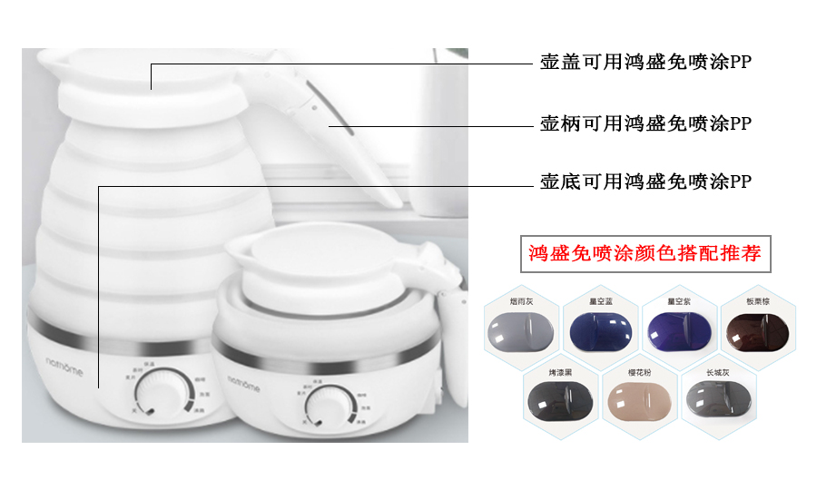 鴻盛新材作為一家在材料領域深耕了17年的公司,食品級材料一直都是我們的優勢,這款產品的壺蓋、壺柄和壺底外殼三部分均可以采用我們鴻盛的免噴涂材料制作。免噴涂塑料作為一種新型環保美學塑料,比起傳統的塑料更多具備了無需噴涂、綠色環保、低VOC等特點,所以假設這款產品塑膠部位使用的是免噴涂塑料進行生產,不僅進一步方便了生產制造商,也能讓消費者更加安心。