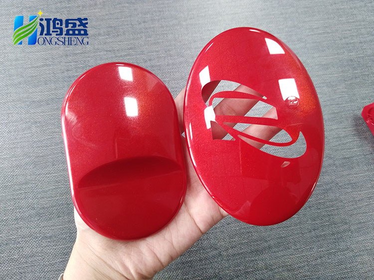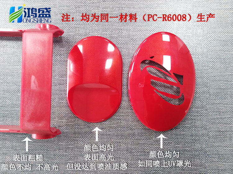 右邊是另一位客戶的樣板,是在140°模溫下通過高光模具注塑出來的,這個跟中間的色牌效果差別不是特別大,但仔細看質(zhì)感上還是有一點差別,中間的雖然也高光,但質(zhì)感還是有點粗糙,沒完全達到鏡面效果。而右邊這個則如同真的噴過UV一樣,達到了噴涂的高光鏡面質(zhì)感。