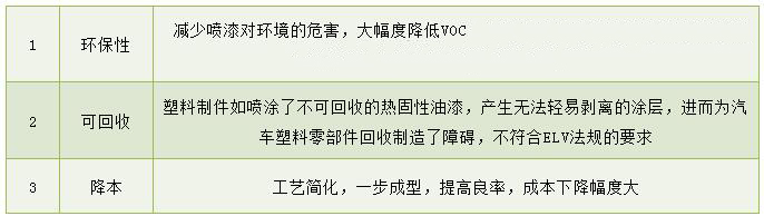 免噴涂塑料在汽車行業的應用上,與噴漆件相比具有較大的優越性,雖然有些材料的耐刮擦性能尚不能滿足主機廠需求,但從環保、綠色理念看,免噴涂材料是汽車內外飾零件使用的趨勢,相信隨著材料、工藝和技術開發研究,免噴涂材料將有更廣闊的應用空間。