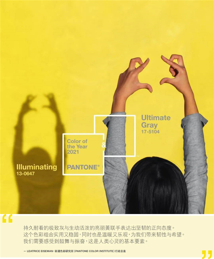 Pantone公布2021年度流行色,“輝煌”組合傳遞正能量 近日,全球知名色彩開發(fā)和研究機構(gòu)潘通色彩研究所(Pantone Color Tnstitute)發(fā)布了2021年度流行色,極致灰(PANTONE 17-5104 Ultimate Gray)與亮麗黃(PANTONE 13-0647 Illuminating),意在傳達持久振奮的力量與希望。這也是自2016年雙色調(diào)水晶粉+寧靜藍之后的第二個雙色調(diào)組合。