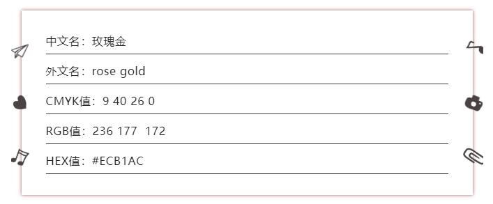 面對這樣一個具有辨識度的“玫瑰金”色彩,如何應用到自己的項目中?首先需要了解它的色彩值。通過百度百科,我們拿到的它的色值如下: