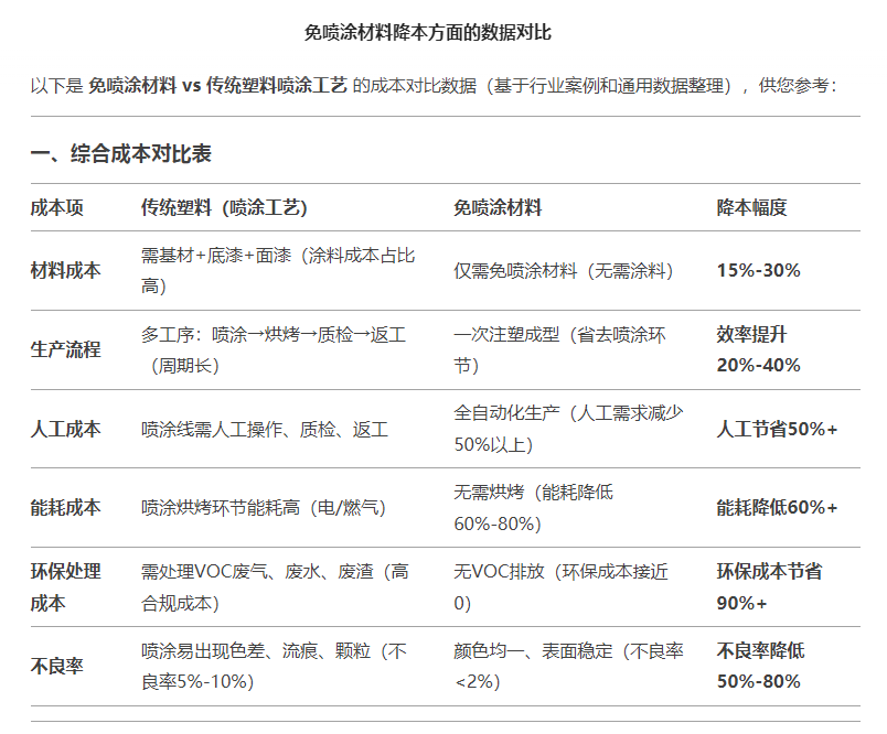 免噴涂工藝的優(yōu)缺點(diǎn):95%的人還在糾結(jié)流痕問(wèn)題 中山鴻盛免噴涂材料公司表示,免噴涂材料是一種新型環(huán)保美學(xué)塑料,可以直接注塑成型無(wú)需噴涂,免噴涂材料廣受各行業(yè)歡迎,引領(lǐng)了高分子色彩及質(zhì)感趨勢(shì),良好的應(yīng)對(duì)多樣化、差別化的市場(chǎng)需求。