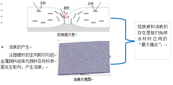熔體在交匯位置處會發生金屬顏料或者珠光顏料的堆集(導致樣件不同位置密度產生差異),產生熔接痕。