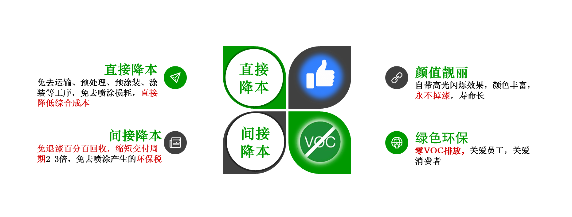 免噴涂材料是一種無需噴涂,可以直接注塑或擠出加工成不同的塑料制件,且自帶絢麗多彩外觀效果的材料。免噴涂制品擁有以下幾個共同優(yōu)點: