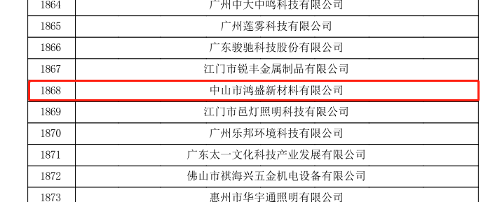 2021年12月20日,全國高新技術企業認定管理工作領導小組辦公室發布《關于對廣東省2021年認定的第二批高新技術企業進行備案公示的通知》,中山市鴻盛新材料有限公司名列其中,成為國家重點支持的具有高成長性的企業。